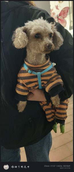 11月20日晚上八点左右在三迪小学附近发现一只走失小狗,浅棕色泰迪,穿着橙棕条纹衣物,佩戴蓝色牵引绳,后脚有绿色防护套,如果有认识主人的请滴滴(18203637127),谢谢啦。